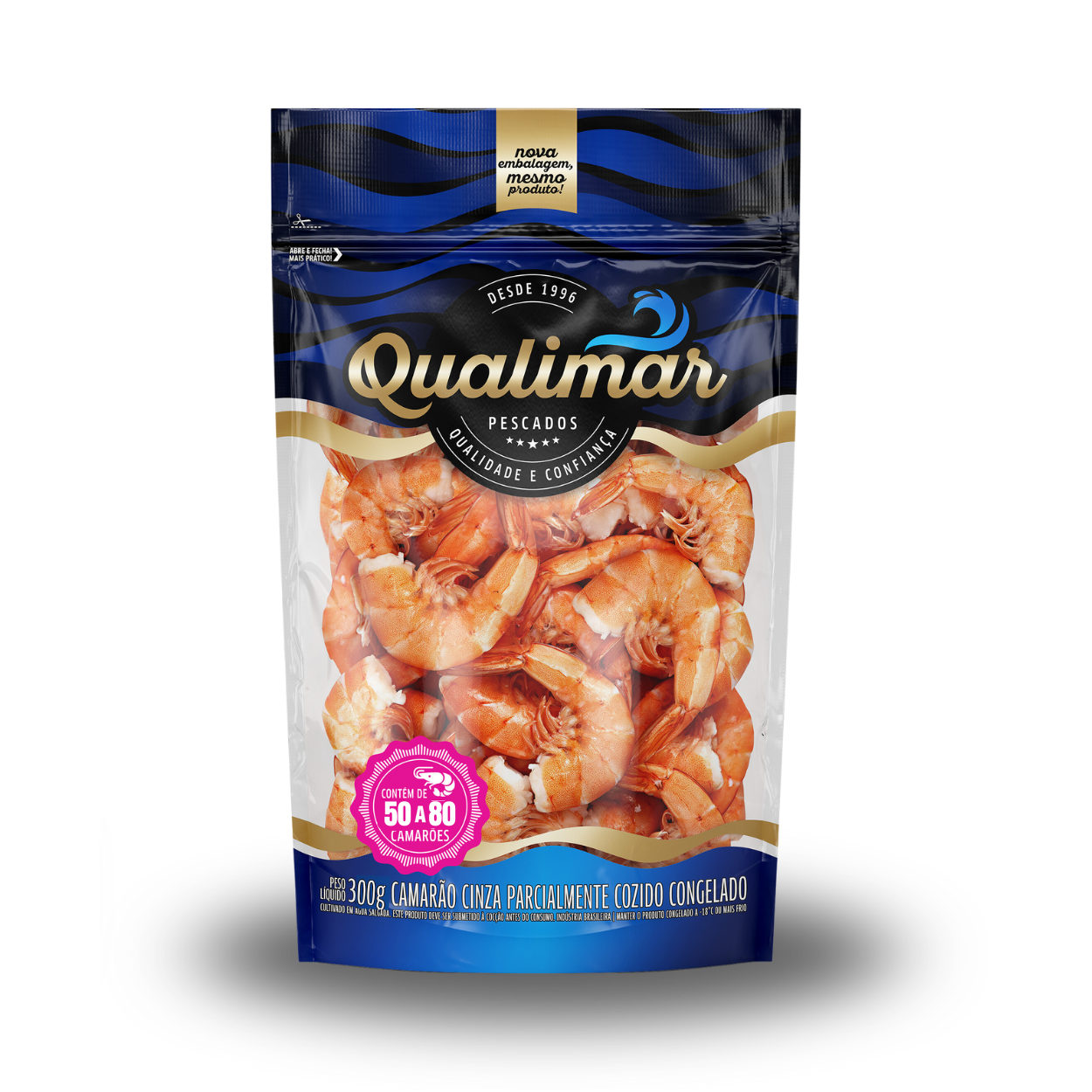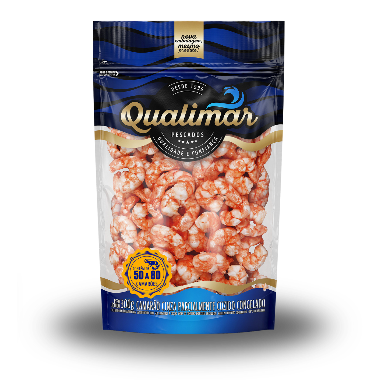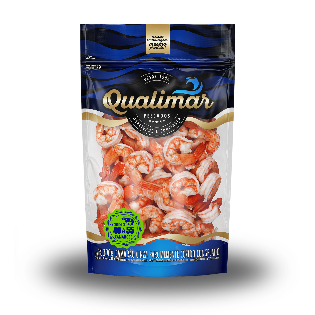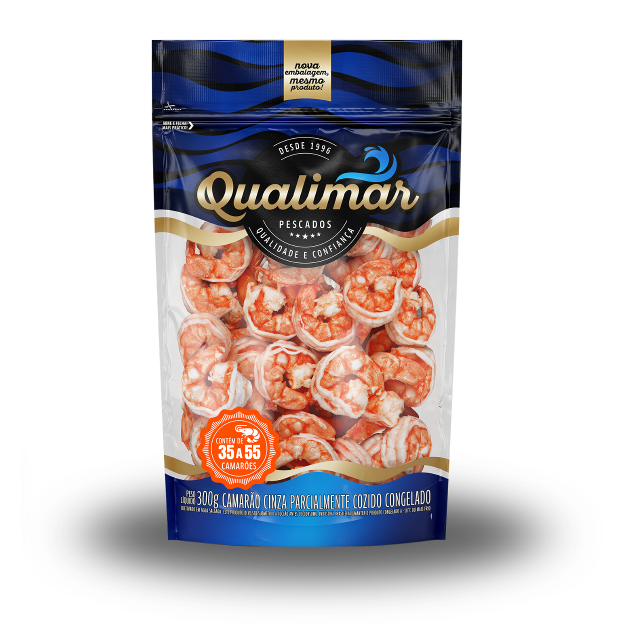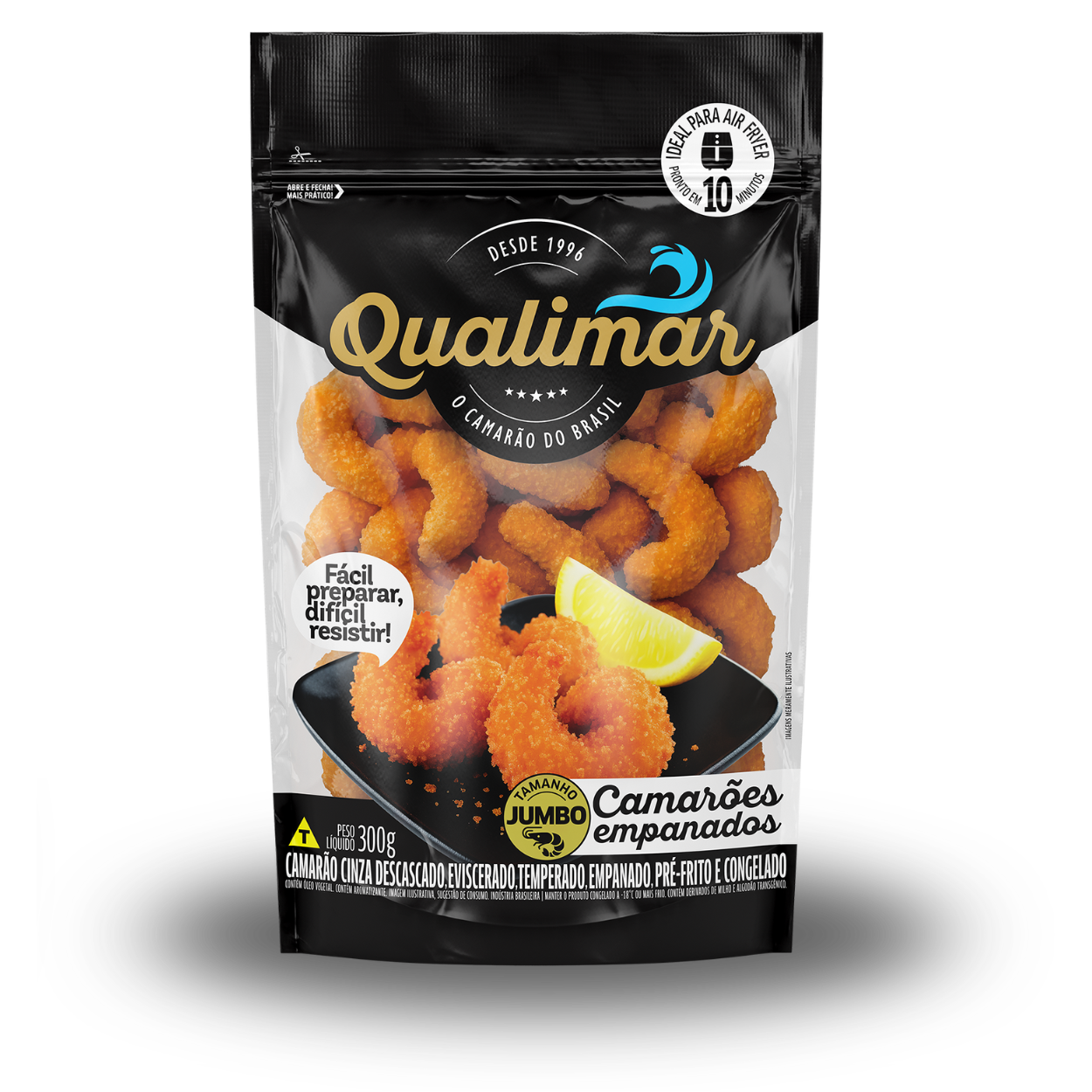 Camarão Cinza descascado, eviscerado, temperado, empanado, pré-frito e congelado embalagem de 300g, com 13 a 16 unidades.