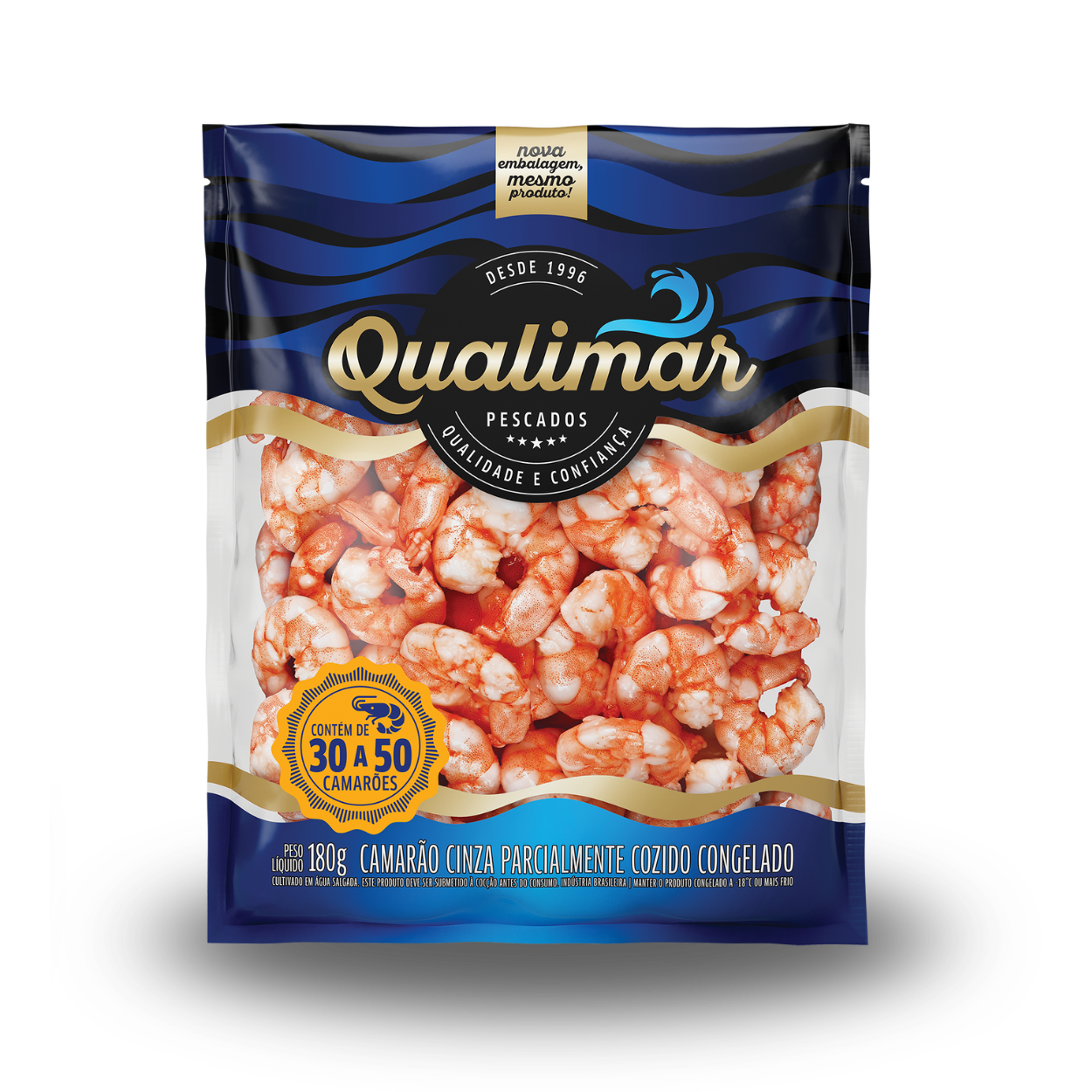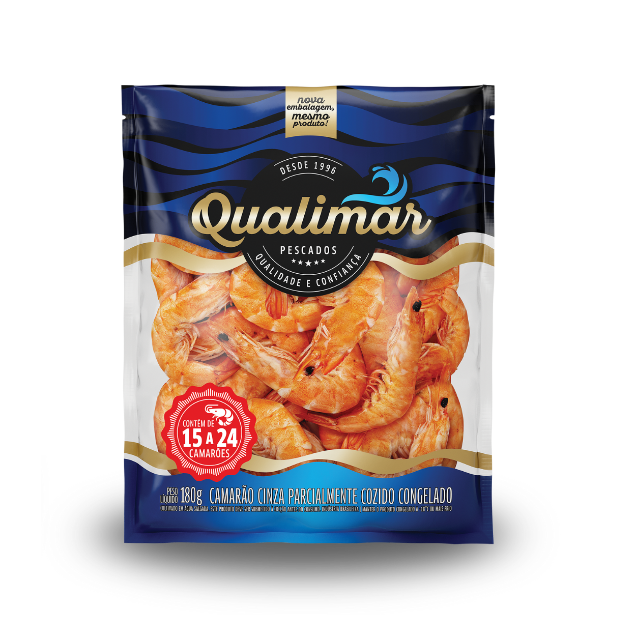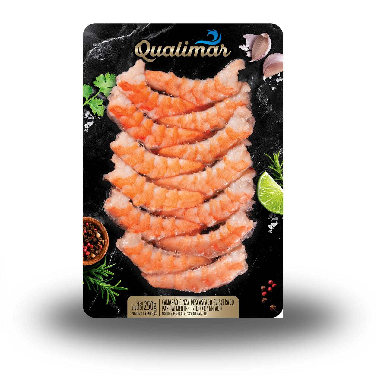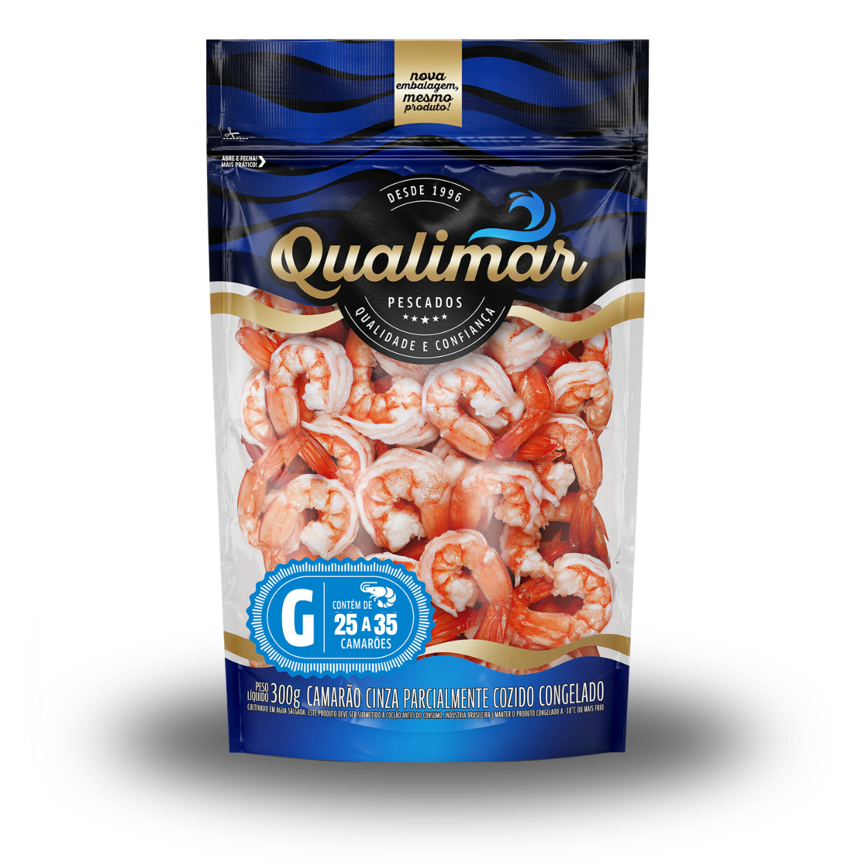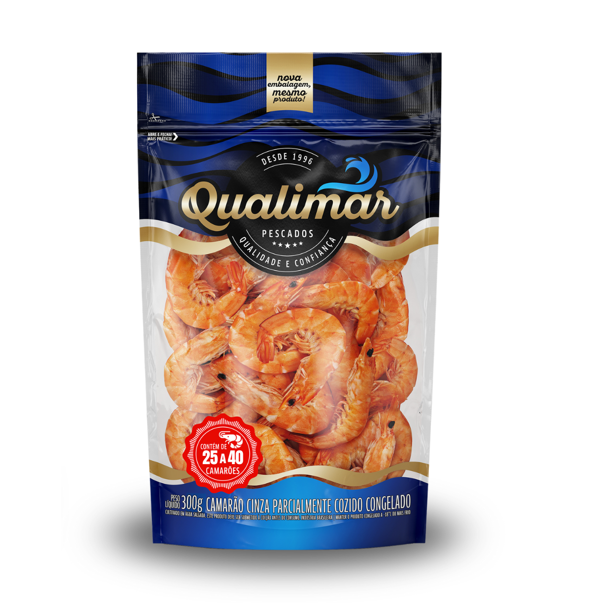 Camarão Cinza descascado, eviscerado, temperado, empanado, pré-frito e congelado embalagem de 300g, com 13 a 16 unidades.